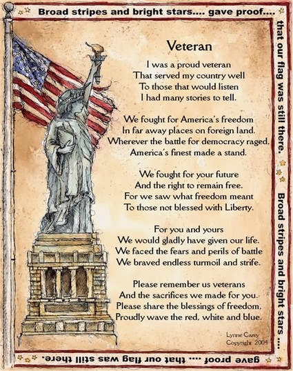 Veterans Day was original created to celebrate the end of WWI on Nov 11, 1918. Which is what the red poppies are about. Fighting ceased between the Allied nations and Germany on the eleventh hour of the eleventh day of the eleventh month. November 11, 1918, is generally regarded as the end of “the war to end all wars.” and the holiday was known as Armistice Day.